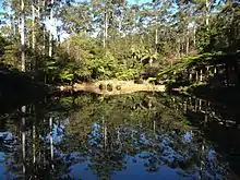 The Witches Falls section, on the eastern side of Mount Tamborine village, became Queensland's first national park in 1908.[1] The main walk here is the Witches Falls Circuit (3 km (1.9 mi)) which snakes down a steep slope through closed in forest into rainforest with cycad groves, seasonal lagoons, enormous strangler figs and palm groves, en route to the falls. An alternative way of seeing the falls is via the Beacon Road Track (four km one way). Access is off Main Western Road (also known as Tamborine Mountain Road and Geissmann Drive). Subtropical rainforest containing large red cedar trees and strangler figs is the predominant vegetation here.[3]