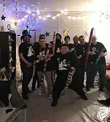 Wizard staff (also known as wisest wizard or wizard sticks or wizard) is a drinking game in which players play individually in an attempt to consume more beer than their opponents. As a player drinks, their current can of beer is taped to the top of their previous cans before being opened. It is then opened and consumed from the top of the staff, making the task more difficult as more beers are consumed, not only because of increased inebriation, but also because it simply becomes more physically challenging as the staff becomes taller. Once a staff is taller than its owner, that person has reached wizard status.[1] At the end of the night, whoever has the longest staff or in other words, has consumed the most beer, may be declared the "wisest wizard".[2]