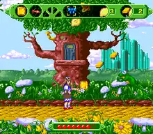 Players can assume the role of any of the four characters with different abilities; the game starts the player with Dorothy, who must rescue the other characters along the way.[2] Each character has a different attack; Dorothy has a kick and a wand that can be powered up with bubbles and shooting stars; the Scarecrow strikes with a pitchfork and scares away crow enemies; the Tin Man has a low-kick and a high ax chop; and the Cowardly Lion attacks with his claws. Each protagonist also have special methods of maneuvering through levels, as Dorothy can float in the air for a limited amount of time through obtaining "flying slippers"; the straw-made Scarecrow can trudge through mud and stand on thin branches; the Lion can climb objects; and the Tin Man can walk safely in swamp liquid.[8] For collecting extra lives and health points, there are icons that only serve specific characters: Glinda's bubble and a blue bow for Dorothy's health points and lives, respectively; a haystack for the Scarecrow's health and a graduation cap to increase his lives; oil cans and hearts for the Tin Man's health points and lives, respectively; and tofus and medals for the vegetarian Cowardly Lion.[9]