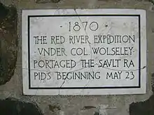 The expedition travelled to Georgian Bay, then by steamer across Lake Huron to the U.S. Sault Canal where men and materiel had to be transported on the Canadian side of the river. The two steamers hired by the Canadian government were the Algoma and the Chicora.[9] The St. Marys canal went through the territory of the United States, critical to moving supplies northward. The first steamer, the Algoma, made it through before the Chichora was stopped. American border agents stopped the steamers due to the movement of soldiers and the materials of war, which were viewed as a threat. The U.S. authorities forced Wolseley to unload the Chicora of all soldiers and materials of wars prior to permitting it to pass.[10] Wolseley then arranged the 4.8 km (3 mi) portage of the soldiers and materials upriver on the Canadian side of the river to be loaded back onto the awaiting Algoma.[11] The expedition then proceeded across Lake Superior to the Department of Public Works station at Thunder Bay, which Wolseley named Prince Arthur's Landing on May 25, in honour of Queen Victoria's third son. From there the troops carried small boats to Lake Shebandowan. On August 3, the first brigades of canoes started their journey towards Fort Garry, leaving from the shores of Shebandowan.[12] The brigades followed the original HBC trapping line until they reached Kashabowie Lake, when they began to follow a new route which Dawson had found and constructed.[13] Travelling further westwards, they passed through Fort Frances, arriving on August 4. Wolseley made it to Lake of the Woods; however, he lost his way. On August 15 he finally made Rat Portage with his flotilla and sent Iroquois guides back to help the remaining brigades cross the river.[14] They proceeded down the Winnipeg River and across the south basin of Lake Winnipeg to the Red River finally arriving at Fort Garry in late August.