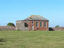 The retaining wall of the causeway leading to the west end of the chapel dates from the early 18th century and is composed of coursed red sandstone. It is listed at Grade II.[3] The chapel is located in a walled enclosure which was formerly a garden. The walls date from the early 17th century and are built from red brick with a stone dressing. They are also Grade II listed.[4]