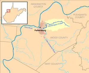Worthington Creek is a tributary of the Little Kanawha River, 15.4 miles (24.8 km) long,[3] in western West Virginia in the United States. Via the Little Kanawha and Ohio rivers, it is part of the watershed of the Mississippi River, draining an area of 35 square miles (91 km2)[4] in the city of Parkersburg and its vicinity.