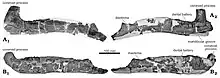 Wulagasaurus is based on GMH W184, a partial dentary (toothbearing bone of the lower jaw). Godefroit and colleagues assigned additional remains from the bonebed to their new genus, including three braincases, a cheekbone, two maxillae (the toothbearing bone of the upper jaw), another dentary, two shoulder blades, two sternal elements, two upper arm bones, and an ischium. It can be distinguished from other hadrosaurids by its slender dentary and the unique form of its upper arm, which had distinctive articulations and placements for muscle attachments. Godefroit and colleagues performed a phylogenetic analysis that suggests Wulagasaurus was the most basal saurolophine known (which would result in a long ghost lineage[5]), and interpreted this as evidence that saurolophines and hadrosaurids in general originated in Asia, which has been supported by other finds since.[4]