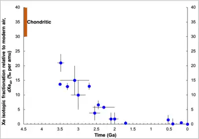 - 1 2 3 4 5 Avice, G.; Marty, B.; Burgess, R.; Hofmann, A.; Philippot, P.; Zahnle, K.; Zakharov, D. (2018). "Evolution of atmospheric xenon and other noble gases inferred from Archean to Paleoproterozoic rocks". Geochimica et Cosmochimica Acta. 232: 82–100. Bibcode:2018GeCoA.232...82A. doi:10.1016/j.gca.2018.04.018. S2CID 55982250.