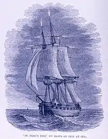Xenophanes was likely the first philosopher to come up with an explanation for the manifestation of St. Elmo's fire that appears on the masts of ships when they pass through clouds during a thunderstorm. Although the actual phenomenon behind St. Elmo's fire would not be understood until the discovery of static electricity in the modern era, Xenophanes' explanation, which attempted to explain the glow as being caused by agitations of small droplets of clouds[lower-alpha 18] was unique in the ancient world.[14]