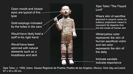 Xipe Totec appears in codices with his right hand upraised and his left hand extending towards the front.[25] Xipe Totec is represented wearing flayed human skin, usually with the flayed skin of the hands falling loose from the wrists.[26] His hands are bent in a position that appears to possibly hold a ceremonial object.[27] His body is often painted yellow on one side and tan on the other.[26] His mouth, lips, neck, hands and legs are sometimes painted red. In some cases, some parts of the human skin covering is painted yellowish-gray. The eyes are not visible, the mouth is open and the ears are perforated.[27] He frequently had vertical stripes running down from his forehead to his chin, running across the eyes.[11] He was sometimes depicted with a yellow shield and carrying a container filled with seeds.[28] One Xipe Totec sculpture was carved from volcanic rock, and portrays a man standing on a small pedestal. The chest has an incision, made in order to extract the heart of the victim before flaying. It is likely that sculptures of Xipe Totec were ritually dressed in the flayed skin of sacrificial victims and wore sandals.[29][30] In most of Xipe Totec sculptures, artists always make emphasis in his sacrificial and renewal nature by portraying the different layers of skin.