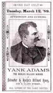 Frank B. Adams (December 19, 1847[1] – December 29, 1929[2]), commonly known as Yank Adams, was a professional carom billiards player who specialized in finger billiards, in which a player directly manipulates the balls with his or her hands, instead of using an implement such as a cue stick,[3] often by twisting the ball between one's thumb and middle finger.[4] Adams, who was sometimes billed as the "Digital Billiard Wonder",[5] has been called the "greatest of all digit billiards players",[6] and the "champion digital billiardist of the World."[7] George F. Slosson, a top billiards player of Adams' era, named him the "greatest exhibition player who ever lived."[6] Adams' exhibitions drew audiences of 1,000 or more, leaving standing room only, even in small venues.[8]