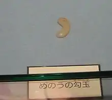 Magatama (勾玉, less frequently 曲玉) are curved, comma-shaped beads that appeared in prehistoric Japan from the Final Jōmon period through the Kofun period, approximately 1000 BCE to the 6th century CE.[1] The beads, also described as "jewels", were made of primitive stone and earthen materials in the early period, but by the end of the Kofun period were made almost exclusively of jade. Magatama originally served as decorative jewelry, but by the end of the Kofun period functioned as ceremonial and religious objects.[2] Archaeological evidence suggests that magatama were produced in specific areas of Japan and were widely dispersed throughout the Japanese archipelago to the Southern Koreanic kingdoms via trade routes.[3]