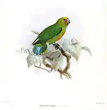 The yellow-capped pygmy parrot (Micropsitta keiensis) is a species of parrot in the family Psittacidae mainly found throughout western New Guinea. Its natural habitats are subtropical or tropical moist lowland forest, subtropical or tropical mangrove forests, and subtropical or tropical moist montane forest. Like many parrots, this pygmy parrot is affectionate to its mate. It is currently unknown if they remain monogamous for life like many bigger parrots because of their isolated location, which is difficult to reach.