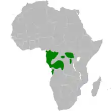 It is found in Angola, Cameroon, Central African Republic, Republic of the Congo, DRC, Equatorial Guinea, Gabon, and Uganda. Its natural habitat is subtropical or tropical moist lowland forests.