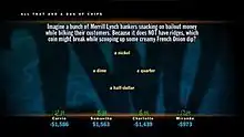 The majority of the game's dialogue is provided by Harry Gottlieb's brother Tom, who had voiced the emcee "Cookie" Masterson in the earlier games, and had been considered one of the more popular emcees by players.[3] Lacking any professional studio, most of the 100-200 hrs of game dialog were recorded in a makeshift soundproofed closet.[5] Tom Gottlieb was also involved in the writing process, as Jellyvision Games credits much of the "Cookie" persona to his own performance of the character.[3][7] Other sound effects include fake commercials that are heard before and after a game; some of these include commercials used in previous iterations of the You Don't Know Jack series.[7] Prior to each questions, the game includes short musical interstitials with animated numbers to introduce the question via its number. These were designed as to get the music for these stuck in the players' heads as something they would remember throughout the day; to avoid making these become too routine, certain episodes featured variations on the interstitial that would be unexpected, keeping players on their toes throughout playing the game.[3]