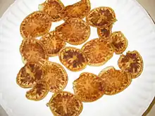 Zebra chip, also known as papa manchada and papa rayada, is a disease in potatoes putatively caused by an alphaproteobacterium "Candidatus Liberibacter solanacearum", which is vectored by the potato psyllid.[2][3] When fried, potato tubers from infected plants develop unsightly black lines resembling the stripes of zebras that render the chips unsellable.[4] Additionally, striped sections of chips frequently burn and caramelize, resulting in a bitter flavor. No health risks have been connected with consumption of infected potato chips.[4]