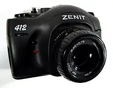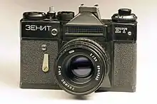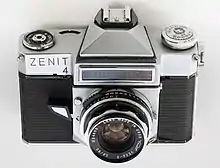 Zenit (Russian: Зени́т) is a Soviet camera brand manufactured by KMZ in the town of Krasnogorsk near Moscow since 1952 and by BelOMO in Belarus since the 1970s. The Zenit trademark is associated with 35 mm SLR cameras. Among related brands are Zorki (Watchful) for 35 mm rangefinder cameras, Moskva (Moscow) and Iskra (Spark) for medium-format folding cameras and Horizon for panoramic cameras. In the 1960s and 1970s, they were exported by Mashpriborintorg to 74 countries.[1]