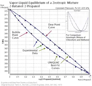 In mixtures of substances, the bubble point is the saturated liquid temperature, whereas the saturated vapor temperature is called the dew point. Because the bubble and dew lines of a zeotropic mixture's temperature-composition diagram do not intersect, a zeotropic mixture in its liquid phase has a different fraction of a component than the gas phase of the mixture.[4] On a temperature-composition diagram, after a mixture in its liquid phase is heated to the temperature at the bubble (boiling) curve, the fraction of a component in the mixture changes along an isothermal line connecting the dew curve to the boiling curve as the mixture boils.[4] At any given temperature, the composition of the liquid is the composition at the bubble point, whereas the composition of the vapor is the composition at the dew point.[5] Unlike azeotropic mixtures, there is no azeotropic point at any temperature on the diagram where the bubble line and dew lines would intersect.[4] Thus, the composition of the mixture will always change between the bubble and dew point component fractions upon boiling from a liquid to a gas until the mass fraction of a component reaches 1 (i.e. the zeotropic mixture is completely separated into its pure components). As shown in Figure 1, the mole fraction of component 1 decreases from 0.4 to around 0.15 as the liquid mixture boils to the gas phase.