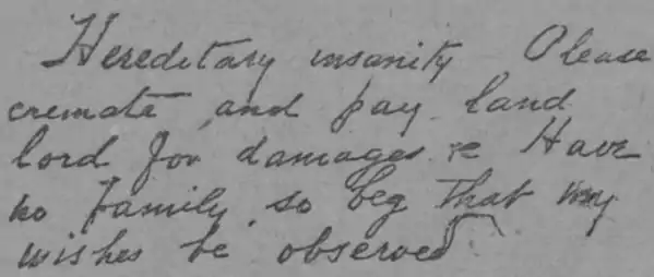 "Hereditary insanity. Please cremate and pay landlord for damages, etc. Have no family, so beg that my wishes be observed"