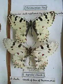 T. cerisyi God. (9d). Closely resembling in colour and pattern the male of Sericinus, being like this spotted with black on a pale yellow ground, the hindwing bearing traces of red near the middle of the costal margin and at the anal angle. Hindwing with only one strongly prominent tooth. Balcan States, Greece and Asia Minor; not so common as polyxena, occurring from April till early June, being still earlier in the southern districts. — The female varies very much ; specimens which are very strongly spotted with black are sold by dealers as ab. obscurior (9d), in albidior (9e) the ground-colour is white, in ochracea (9e) bright yellow, and in pallidior (9d) fallow; in ab. flavomaculata Verity the carmine dots are replaced by dots of honey-colour; all these aberrations occur together with ordinary cerisyi. — caucasica Led.[now species Allancastria caucasica (9e) has in both sexes very large, broad, black costal spots on the forewing, the hindwing being sUghtly and almost evenly scalloped, the middle tooth hardly projecting; in Armenia. — deyrollei Oberth.[ now species Allancastria deyrollei] (9d) has the three teeth before the anal angle of the hindwing prolonged into short tails; in the coast districts of the Black Sea, in the whole of Asia Minor, southward to Syria; extremely common, in some places appealing in enormous numbers. — cretica Reb. (9e) [now species Allancastria cretica] occurs on Crete and some Greek islands; a sparsely marked form in which the three teeth of the hindwing mentioned above are indicated only by black curved lines, the edge of the wing not being distinctly excised. Not so common as the preceding. — Larva yellow, brown or reddish, the tubercles being red; from May till July, on Aristolochia. Pupa dust-colour or yellowish grey, variegated with thin black dashes , especially on the head. — The buttertlies are on the wing on the first warm days of the year at rocky places and the edges of woods. [1]