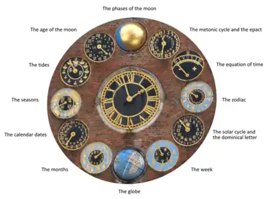 The Centenary clock has one large dial in the centre, measuring 1.5 metres (4 ft 11 in) in diameter. This dial shows the exact time (UTC+1; during daylight saving time UTC+2 is used instead). The twelve dials around the centre dial show the following (starting from the dial in the 2 o'clock position and going clockwise): the equation of time, the zodiac, the solar cycle and the dominical letter, the week, the globe, the months, the calendar dates, the seasons, the tides, the age of the moon, the phases of the moon and the metonic cycle and the epact.