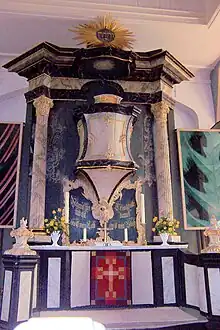 The brick hall church is not oriented, but directed on a southwest–northeast axis.[2] Its else rather modest interior is beautified by a typical Protestant Kanzelaltar, combining pulpit and altar table, created in Rococo forms.[2] The pulpit altar is structured by columns and pilasters, in their midst the pulpit.[2] It bears the Tetragrammaton יהוה in a top auriole and to the left of the pulpit the king's rocaille-ornamented initials GR (Georgius Rex, hidden on the photo by a painting of a temporary exhibition).[2]