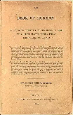 The Book of Mormon is a sacred text of the Latter Day Saint movement and Mormonism. It is regarded by Latter Day Saints as divinely revealed and is named after the prophet–historian Mormon who, according to the text, compiled most of the book. It was published by the founder of the LDS movement, Joseph Smith, Jr., in March 1830 in Palmyra, New York, USA.