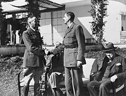 • In the course of the Casablanca Conference, General de Gaulle, who was in London, had been invited by the Prime Minister to come to North Africa. De Gaulle was offended that he had not been invited further in advance, and in one way and another proved to be his usual difficult self. Mr. Eden, the Foreign Secretary, had to exert great pressure to induce him to leave London for Casablanca. When he arrived there the firmest treatment by Mr. Churchill was required to persuade him to call upon Giraud. Finally in the interests of at least good public feeling a "shot-gun marriage" was arranged. At a press conference on 24 January, De Gaulle and Giraud were made to sit in a row of chairs, alternating with Mr. Roosevelt and Mr. Churchill, and to be photographed shaking hands. As the newsreel cameras finished their work, each French general dropped the other's hand as though it were red hot.