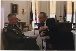 - The President of the United States of America, authorized by Act of Congress, July 9, 1918, takes pleasure in presenting a Bronze Oak Leaf Cluster in lieu of a Second Award of the Army Distinguished Service Medal to General Douglas MacArthur (ASN: 0-57), United States Army, for exceptionally meritorious and distinguished services to the Government of the United States, in a duty of great responsibility. As Chief of Staff of the Army of the United States from 21 November 1930 to 1 October 1935, General MacArthur performed his many important and exacting duties with signal success. He devised and developed the Four-Army organization of our land forces; he conceived and established the GHQ Air Force, thus immeasurably increasing the effectiveness of our air defenses; he initiated a comprehensive program of modernization in the Army's tactics, equipment, training, and organization. In addition, the professional counsel and assistance he continuously rendered to the President, to the Secretary of War, and to the Congress were distinguished by such logic, vision, and accuracy as to contribute markedly to the formulation of sound defense policies and the enactment of progressive laws for promoting the Nation's security.