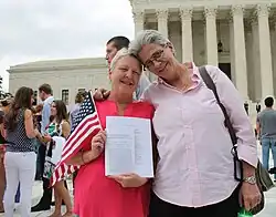 Lesbian couple standing in front of the US Supreme Court after the Obergefell ruling.