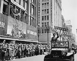 - I went home and stayed at Green Meadows. A couple of days later we all went up to Boston and the aircraft landed. I'll never forget it. My dad got out of the aircraft and he really looked super; he was fifty-nine years old at the time. WIth him in the aircraft were a couple of division commanders, including John W. O'Daniel, who had lost his son in the Normandy invasion and who later became my commanding general at the Infantry School at Fort Benning when I went through the basic officers course in 1946. Also aboard was Leon Johnson [USAF], who had been awarded the Medal of Honor for the Ploesti Raid, followed by eight or nine noncoms, not one of whom was wearing less than a Silver Star. All of this was followed by a ticker-tape parade through Boston. That evening my father spoke at the Shell on the Esplanade in Boston. We came home that night quite late and the next morning he came upstairs and woke me up and said we were going for breakfast. I ate breakfast with him and then I got on a train and went back to West Point. It was the last time I ever saw him.
