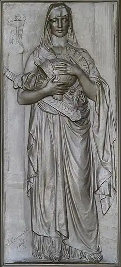 - Memory, in widow's weeds, with naked feet stands on a tombstone.