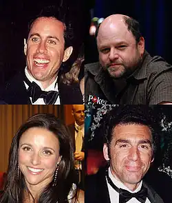 Main cast, clockwise: Jerry Seinfeld (a fictional version of himself), Jason Alexander (George), Micheal Richards (Kramer), and Julia Louis-Dreyfus (Elaine)