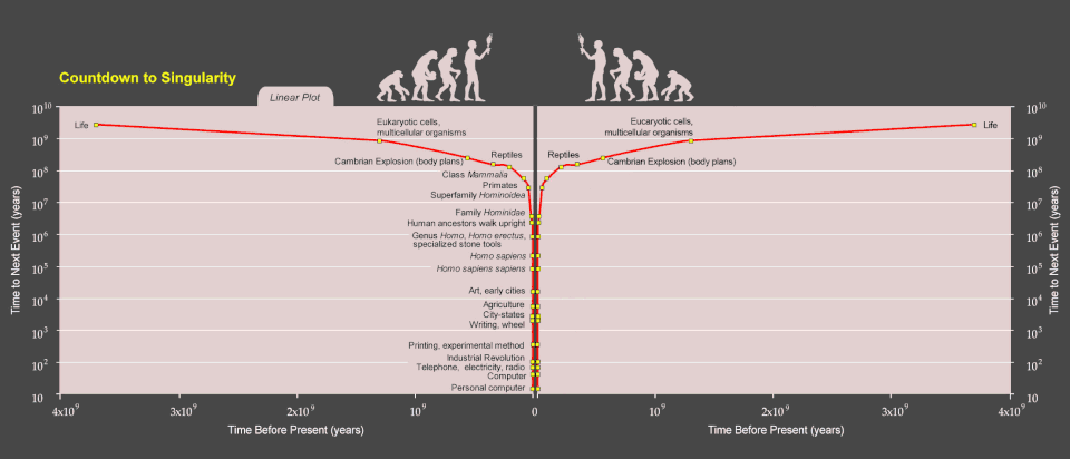 It’s this idea that we represent some kind of singularity, or that we announce the nearby presence of a singularity. That the evolution of life and cultural form and all that is clearly funneling toward something fairly unimaginable.