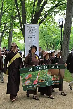 It also depends on us. Our way of walking on the Earth has a great influence on animals and plants. We have killed so many animals and plants and destroyed their environments. Many are now extinct. In turn, our environment is now harming us. We are like sleepwalkers, not knowing what we are doing or where we are heading. Whether we can wake up or not depends on whether we can walk mindfully on our Mother Earth. The future of all life, including our own, depends on our mindful steps.- The statement "The future of all life, including our own, depends on our mindful steps." and much of the theme of this essay also occur later in his writings, including The World We Have : A Buddhist Approach to Peace and Ecology (2008), Ch. 1 : The Bells of Mindfulness, p. 3
