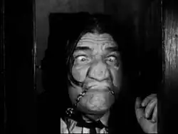 - [Curly takes the canvas and hits the landlord, dragging through to his midsection.]