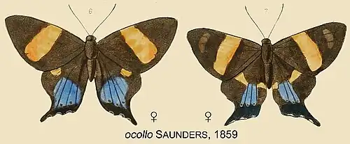 - Erycina ocollo Saunders, 1859: 105, pl.10 figs 6,7, Type ♀ images. Synonymised by Lamas, 2004: 149.