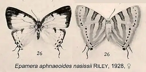 - Epamera aphnaeoides nasissii Riley, 1928: 391, Pl.X,XI, Fig.26.