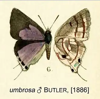 - Hypolycaena umbrosa Butler, [1886]: 766, pl.47, fig.6