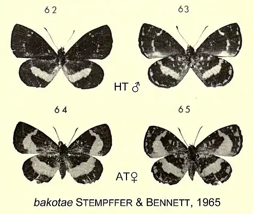 - Micropentila bakotae Stempffer & Bennett, 1965: 416, text fig.17, pl.2, figs 62-65; Williams, 2007: Liptenina 62.