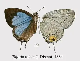 • Tajuria relata Distant, [1884]: : 246, pl. 21, fig. 12.