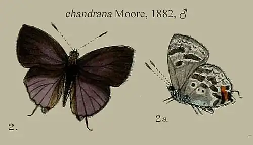 - Hypolycaena chandrana Moore, 1882: 249, pl.11 figs 2,2a ♂; de Nicéville, [1884]: 78, pl.9 fig.1 ♀.