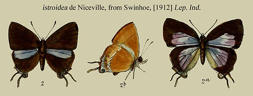 - Tajuria istroidea de Nicéville, 1887: 458, pl. 40, f. 3 ♀; 1889: 286, pl. 14, fig. 14 ♂; 1890: 384, pl. 25, fig. 142 ♂; Swinhoe, [1912]: 120, pl. 727, figs 2, 2b ♂, 2a ♀.