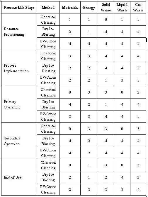 Chemical cleaners received relatively high score due to the fact that the cleaning process is fairly simple and does not require complicated machinery. Equipments such as soak tubs can be made with recycled metals. In addition, very little residues are produced during implementation since only the required amount of the cleaner needs to be used with excess stored away for later. Dry ice blasting does not release significant waste during the implementation process. Various virgin materials are used to build the blasting machine; however, they are recyclable making the machine less harmful to the environment. In UV/Ozone cleaning, the comparably low rank is due to the use of mercury in the lamp and the gas waste released from the test experiments for more effective cleaning [6].
