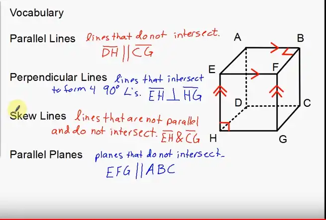 - Parallel (||, parallel lines symbol--is parallel to) lines do not intersect and are coplanar (please refer back to the first lesson if you have forgotten the definition of "coplanar").