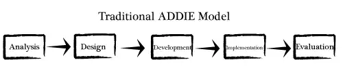 Most traditional design models follow the basic ADDIE model in a linear fashion, as the diagram below indicates. Each step is usually well-defined and separated from one another.