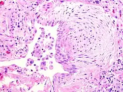 | Atherosclerosis | Atherosclerosis showing extracellular lipid accumulation and foam cells. | Category: Histopathology of atherosclerosis | Atherosclerosis | |