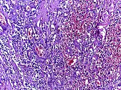 ![]() | Granulation tissue | Micrograph showing proliferating capillaries, fibroblasts and acute inflammatory cells. | Category: Histopathology of granulation tissue | Granulation tissue |