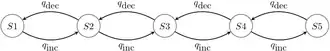 - Asymmetrical Markov -state 2 parameter model (Figure 4): in this model, the state space is ordered (so that, for example, state 1 is smaller than state 2, which is smaller than state 3), and transitions may only occur between adjacent states. This model contains two parameters and : one for the rate of increase of state (e.g. 0 to 1, 1 to 2, etc.), and one for the rate of decrease in state (e.g. from 2 to 1, 1 to 0, etc.).