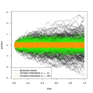 - Ornstein-Uhlenbeck process: in brief, an Ornstein-Uhlenbeck process is a continuous stochastic process that behaves like a Brownian motion, but attracted toward some central value, where the strength of the attraction increases with the distance from that value. This is useful for modelling scenarios where the trait is subject to stabilizing selection around a certain value (say ). Under this model, the above-described transition of being in state to being in state would have a likelihood defined by the transition density of an Ornstein-Uhlenbeck process with two parameters: , which describes the variance of the driving Brownian motion, and , which describes the strength of its attraction to . As tends to , the process is less and less constrained by its attraction to and the process becomes a Brownian motion (Figure 5). Because of this, the models may be nested, and log-likelihood ratio tests discerning which of the two models is appropriate may be carried out.[42]