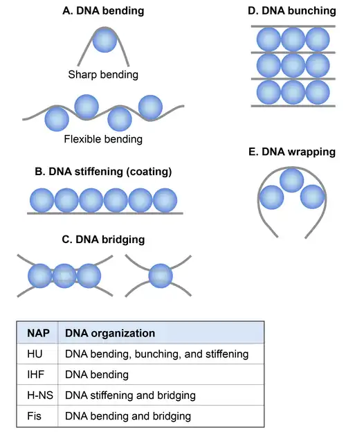 A nucleosome consists of ~146 bp of DNA wrapped around an octameric complex of the histone proteins. Although bacteria do not have histones, they possess a group of DNA binding proteins referred to as nucleoid-associated proteins (NAPs) that are functionally analogous to histones in a broad sense. NAPs are highly abundant and constitute a significant proportion of the protein component of nucleoid.[14]
