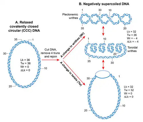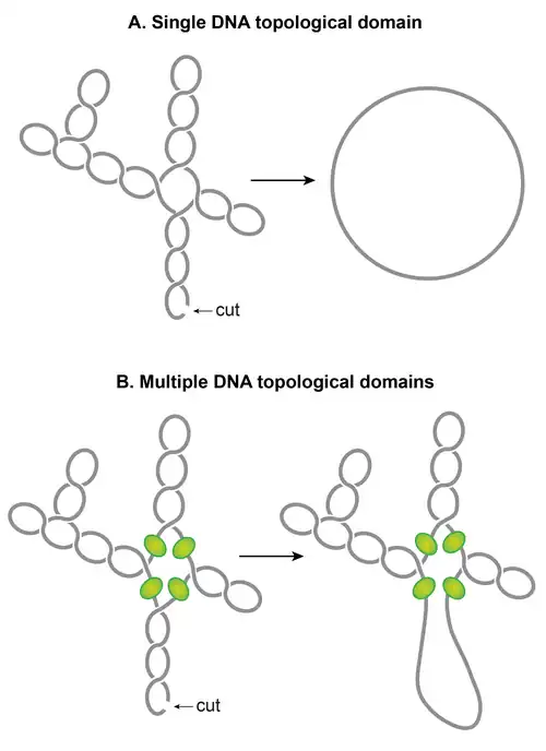 {{citation}}: CS1 maint: PMC format (link) - ↑ Leng, F.; Chen, B.; Dunlap, D. D. (2011-12-13), "Dividing a supercoiled DNA molecule into two independent topological domains", Proceedings of the National Academy of Sciences, 108 (50): 19973–19978, doi:10.1073/pnas.1109854108, ISSN 0027-8424, PMC 3250177, PMID 22123985