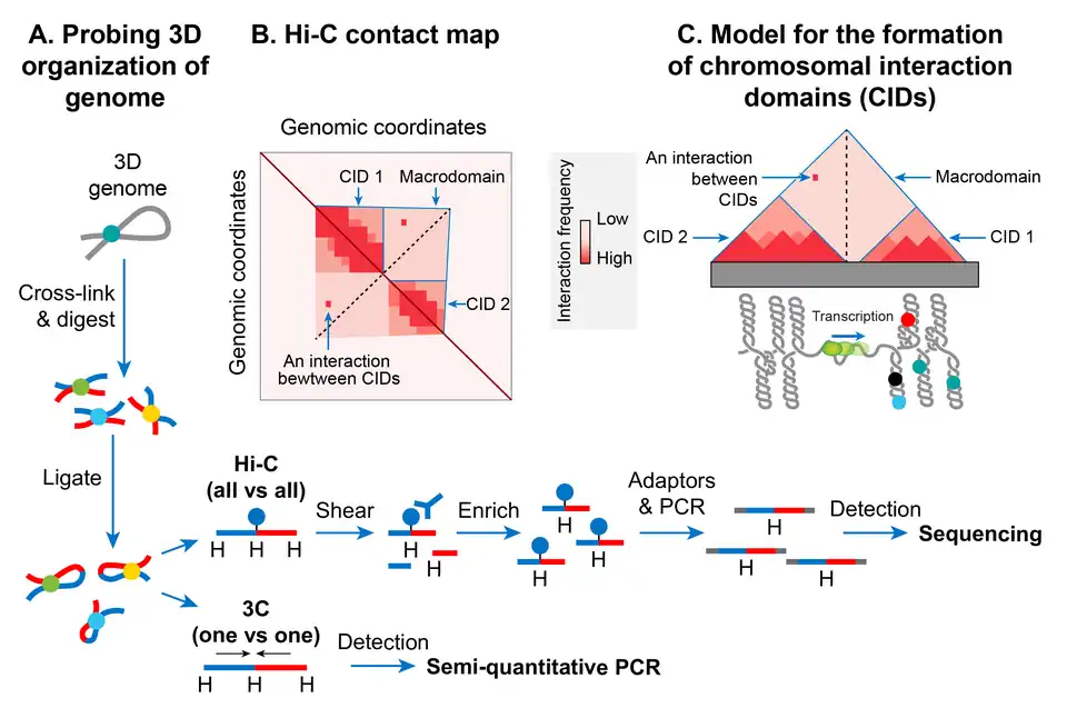 In recent years, the advent of a molecular method called chromosome conformation capture (3C) has allowed studying a high-resolution spatial organization of chromosomes in both bacteria and eukaryotes.[123] 3C and its version that is coupled with deep sequencing (Hi-C)[124] determine physical proximity, if any, between any two genomic loci in 3D space (Fig. 8A and B). A high-resolution contact map of bacterial chromosomes including the E. coli chromosome has revealed that a bacterial chromosome is segmented into many highly self-interacting regions called chromosomal interaction domains (CIDs) (Fig. 8B).[125][126][127] CIDs are equivalent to topologically associating domains (TADs) observed in many eukaryotic chromosomes,[128] suggesting that the formation of CIDs is a general phenomenon of genome organization. Two characteristics define CIDs or TADs. First, genomic regions of a CID physically interact with each other more frequently than with the genomic regions outside that CID or with those of a neighboring CID. Second, the presence of a boundary between CIDs that prevents physical interactions between genomic regions of two neighboring CIDs.