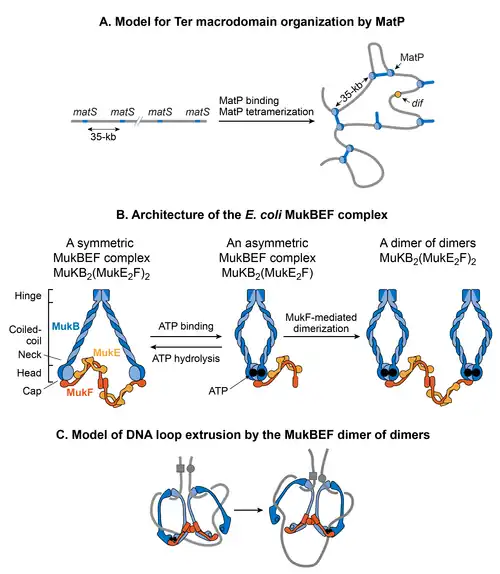 MukBEF complex, together with Topo IV, is required for decatenation and repositioning of newly replicated oriCs.[145][146][147][148][133] The role of MukBEF is not restricted during DNA replication. It organizes and condenses DNA even in non-replicating cells.[149] The recent high-resolution chromosome conformation map of the MukB-depleted E. coli strain reveals that MukB participates in the formation of DNA-DNA interactions on the entire chromosome, except in the Ter domain.[125] How is MukB prevented from acting in the Ter domain? MatP physically interacts with MukB, thus preventing MukB from localizing to the Ter domain.[133] This is evident in the DNA binding of MatP and MukB in the Ter domain. DNA binding of MatP is enriched in the Ter domain, whereas DNA binding of MukB is reduced compared to the rest of the genome (Fig. 9). Furthermore, in a strain already lacking MatP, the absence of MukB causes a reduction in DNA contacts throughout the chromosome, including the Ter domain.[125] This result agrees with the view that MatP displaces MukB from the Ter domain.